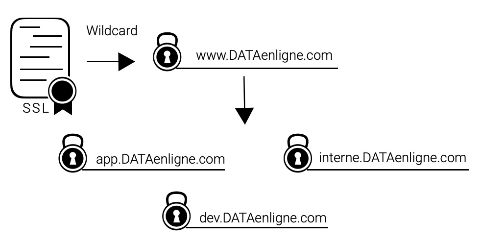 - Le Wildcard – pour 1 seul nom de Domaine (avec ou sans le www.) et tous ses sous-domaines – ex.: www.DATAenligne.com ou DATAenligne.com et app.DATAenligne.com; dev.DATAenligne.com; interne.DATAenligne.com