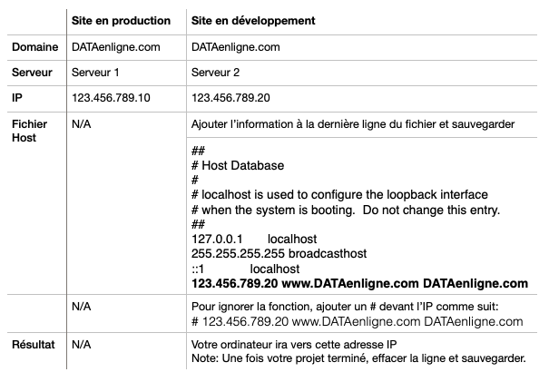 Cette fonction est utile lorsque vous développez un nouveau site à partir d’un nom de Domaine déjà en ligne ou que le site en développement hébergé dans un autre serveur et dont l’adresse IP diffère du site en production. En ajoutant une exception, vous forcerez votre ordinateur à passer par le chemin indiqué comme l’indique le tableau suivant.